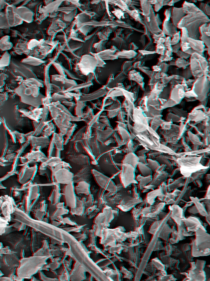 Vues en stéréoscopie anaglyphe d’un échantillon de poussière observé au microscope électronique à balayage, évoquant un monde à la fois minéral et végétal, comme une réminiscence de notre environnement naturel, s’invitant dans nos univers domestiques aseptisés.