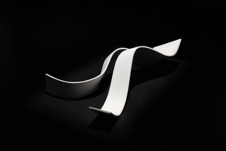 À l’entrée dans le cristal de calcite, le rayon se dissocie en se polarisant, donnant naissance au rayon ordinaire, qui poursuit sa course, et au rayon extraordinaire qui, lui, se voit dévié. Cette sculpture donne corps à cet instant en l’étirant sur une longueur d’onde et demi jusqu’à décrire un fragile mouvement qui aurait été figé dans la matière.