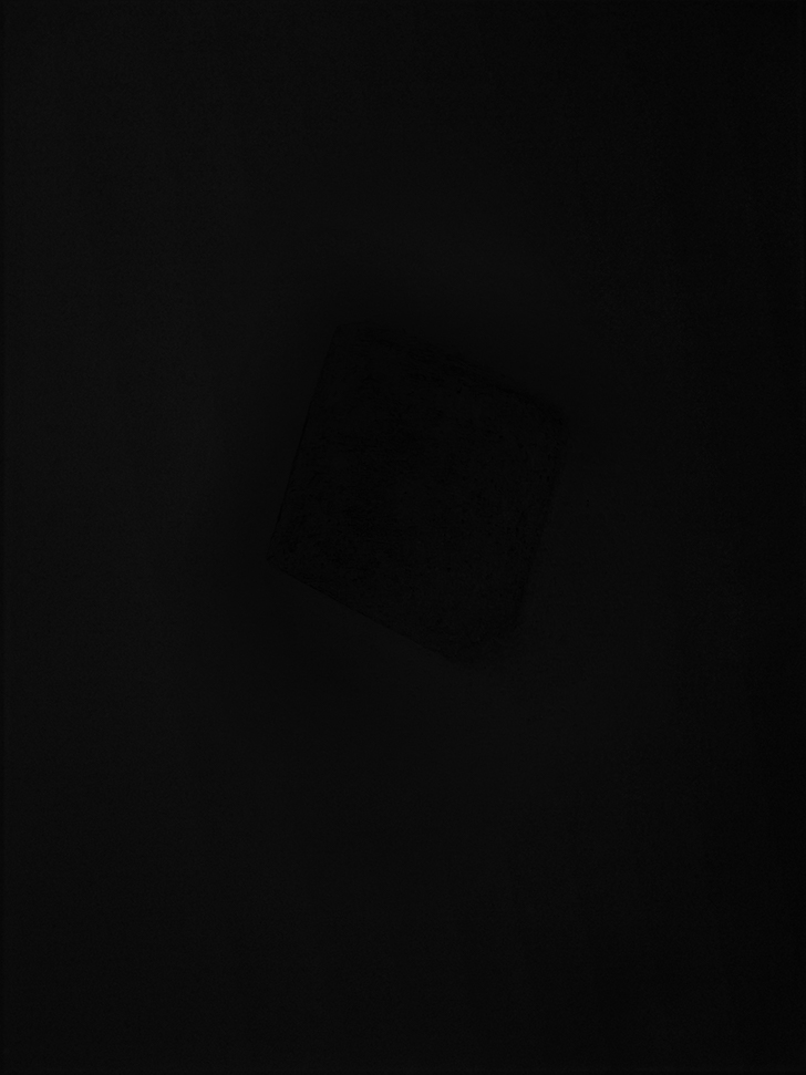 La série noire rassemble trois tableaux sur lesquels sont reproduites les silhouettes se découpant dans la couche de poussière figée entre les verres de la série blanche. La poudre de charbon, appliquée et fixée sur la toile, se fond ou se détache de la surface selon le point de vue de l’observateur.